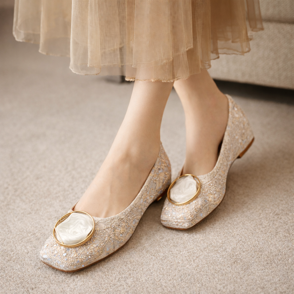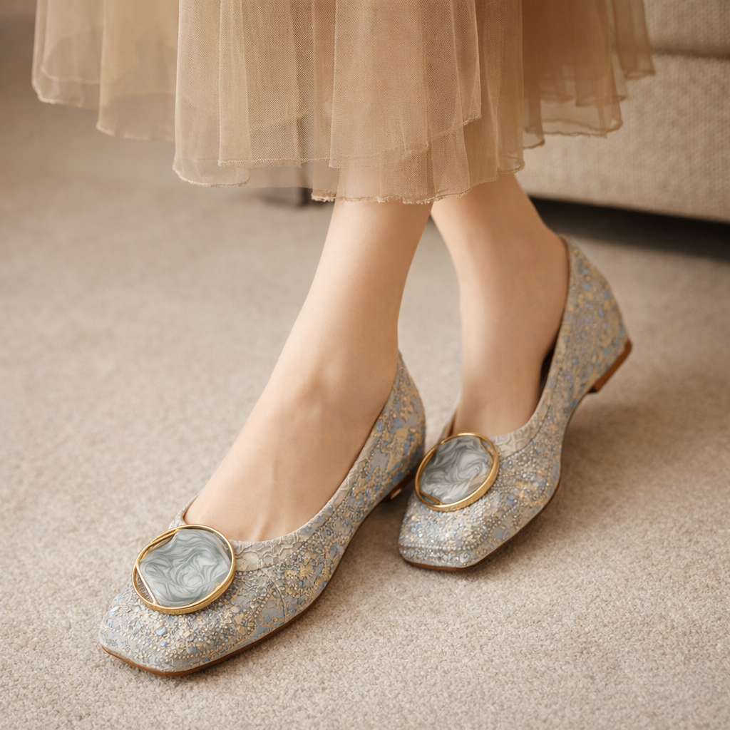 Crafted with shimmering lace and a distinctive marbled medallion, these flats combine style with comfort. The softly cushioned insole and elegant square toe design make them perfect for everyday wear.